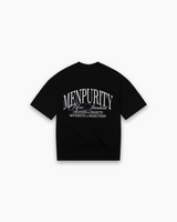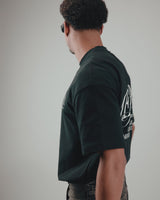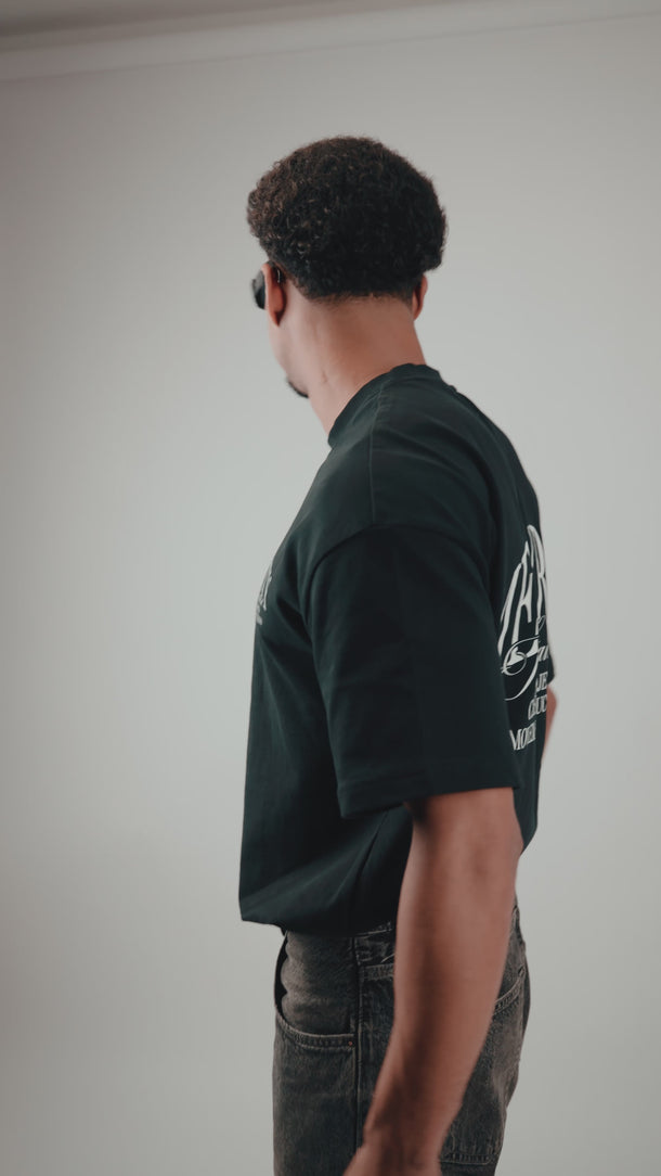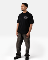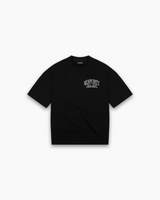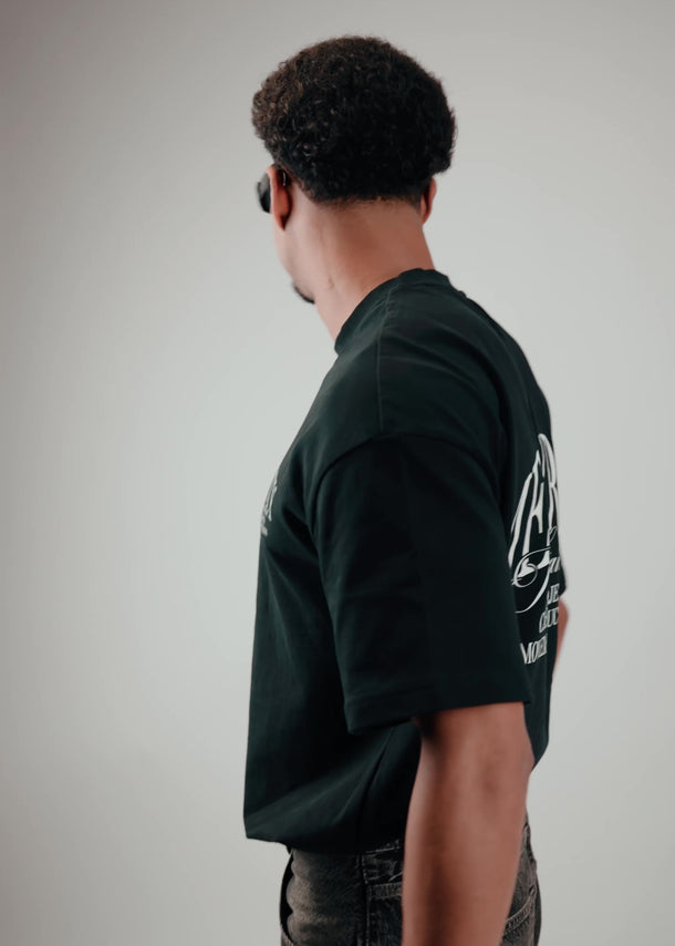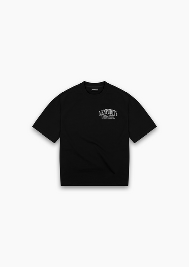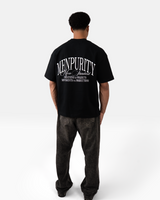 Introducing the New Standard Shirt in Jet Black, crafted from premium 250gsm heavyweight cotton for a substantial yet comfortable feel. This oversized T-shirt showcases bold screen-printed New Standard logos on the front and back, paired with a thick ribbed neck for our signature structured fit. Featuring an elegant script detail that effortlessly blends luxury into everyday wear.